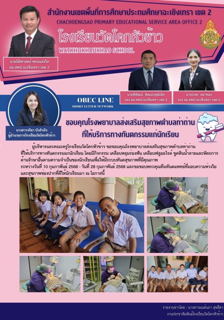 ผู้บริหารและคณะครูโรงเรียนวัดโคกหัวข้าว ขอขอบคุณโรงพยาบาลส่งเสริมสุขภาพตำบลท่าถ่าน ที่ให้บริการทางทันตกรรมแก่นักเรียน โดยมีกิจกรรม เคลือบหลุมร่องฟัน เคลือบฟลูออไรด์ ขูดหินน้ำลายและหัตถการ ด้านรักษาอื่นตามความจำเป็นของนักเรียนเพื่อให้มีระบบทันตสุขภาพที่มีคุณภาพ ระหว่างวันที่ 10 กุมภาพันธ์ 2568 - วันที่ 28 กุมภาพันธ์ 2568 และขอขอบพระคุณทีมทันตแพทย์ที่มอบความห่วงใย และสุขภาพช่องปากที่ดีให้นักเรียนมา ณ โอกาสนี้