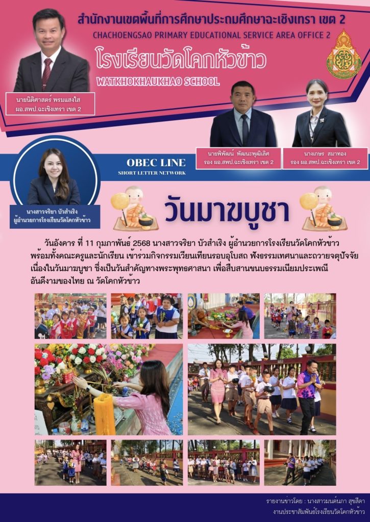 วันอังคาร ที่ 11 กุมภาพันธ์ 2568 นางสาวจริยา บัวสำเริง ผู้อำนวยการโรงเรียนวัดโคกหัวข้าวพร้อมทั้งคณะครูและนักเรียน เข้าร่วมกิจกรรมเวียนเทียนรอบอุโบสถ