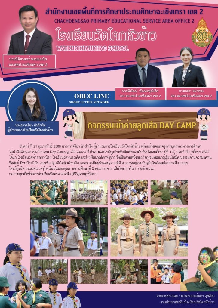 วันศุกร์ ที่ 21 กุมภาพันธ์ 2568 นางสาวจริยา บัวสำเริง ผู้อำนวยการโรงเรียนวัดโคกหัวข้าว พร้อมด้วยคณะครูและบุคลากรทางการศึกษา ได้นำนักเรียนเข้าร่วมกิจกรรม Day Camp ลูกเสือ-เนตรนารี สำรองและสามัญ(สำหรับนักเรียนระดับชั้นประถมศึกษาปีที่ 1-5) ประจำปีการศึกษา 2567 ได้แก่ โรงเรียนวัดท่าลาดเหนือฯ โรงเรียนวัดหนองเค็ดและโรงเรียนวัดโคกหัวข้าว ซึ่งเป็นส่วนหนึ่งของกิจกรรมพัฒนาผู้เรียนให้มีคุณธรรมด้านความอดทนซื่อสัตย์ มีระเบียบวินัย และเพื่อปลูกฝังให้นักเรียนมีภาวะความเป็นผู้นำและผู้ตามที่ดี สามารถอยู่ร่วมกับผู้อื่นในสังคมได้อย่างมีความสุข โดยมีผู้บริหารและคณะครูโรงเรียนในเขตคุณภาพการศึกษาที่ 2 พนมสารคาม เป็นวิทยากรในการจัดกิจกรรมณ ค่ายลูกเสือชั่วคราวโรงเรียนวัดท่าลาดเหนือ (หิรัญราษฎร์วิทยา)