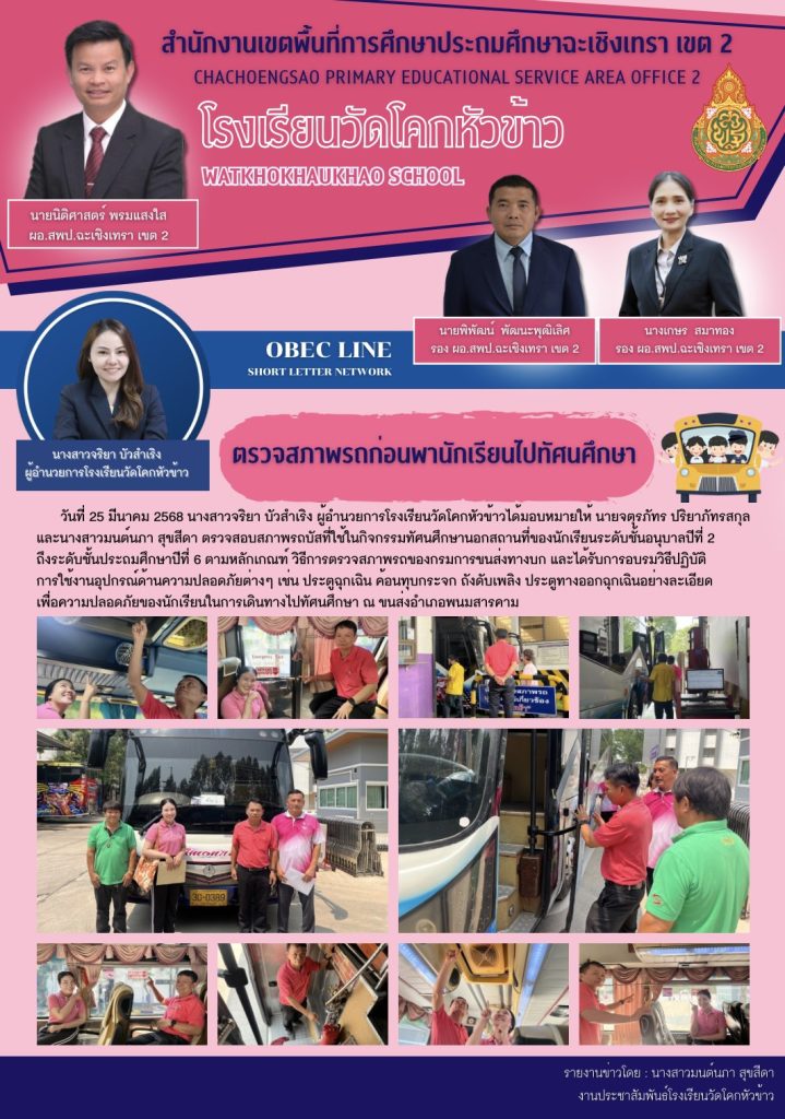 วันที่ 25 มีนาคม 2568 นางสาวจริยา บัวสำเริง ผู้อำนวยการโรงเรียนวัดโคกหัวข้าวได้มอบหมายให้ นายจตุรภัทร ปริยาภัทรสกุลและนางสาวมนต์นภา สุขสีดา ตรวจสอบสภาพรถบัสที่ใช้ในกิจกรรมทัศนศึกษานอกสถานที่ของนักเรียนระดับชั้นอนุบาลปีที่ 2 ถึงระดับชั้นประถมศึกษาปีที่ 6 ตามหลักเกณฑ์ วิธีการตรวจสภาพรถของกรมการขนส่งทางบก และได้รับการอบรมวิธีปฏิบัติ การใช้งานอุปกรณ์ด้านความปลอดภัยต่างๆ เช่น ประตูฉุกเฉิน ค้อนทุบกระจก ถังดับเพลิง ประตูทางออกฉุกเฉินอย่างละเอียด เพื่อความปลอดภัยของนักเรียนในการเดินทางไปทัศนศึกษา ณ ขนส่งอำเภอพนมสารคาม
