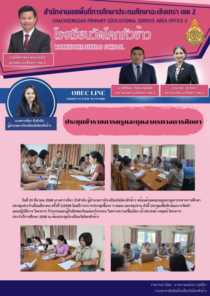 วันที่ 20 มีนาคม 2568 นางสาวจริยา บัวสำเริง ผู้อำนวยการโรงเรียนวัดโคกหัวข้าว พร้อมด้วยคณะครูและบุคลากรทางการศึกษา ประชุมประจำเดือนมีนาคม ครั้งที่ 2/2568 โดยมีวาระการประชุมชี้แจง วางแผน และสรุปงาน ดังนี้ ประชุมเพื่อซักซ้อมการจัดทำแผนปฏิบัติการ โครงการ กิจกรรมและผู้รับผิดชอบในแต่ละกิจกรรม วิเคราะห์ความเชื่อมโยง เป้าประสงค์ กลยุทธ์ โครงการ ประจำปีการศึกษา 2568 ณ ห้องประชุมโรงเรียนวัดโคกหัวข้าว