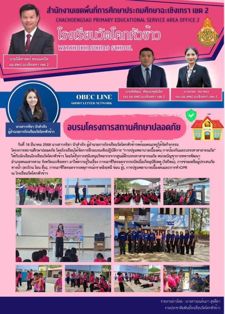 วันที่ 18 มีนาคม 2568 นางสาวจริยา บัวสำเริง ผู้อำนวยการโรงเรียนวัดโคกหัวข้าวพร้อมคณะครูได้จัดกิจกรรมโครงการสถานศึกษาปลอดภัย โดยโรงเรียนได้จัดการฝึกอบรมเชิงปฏิบัติการ “การปฐมพยาบาลเบื้องต้น การป้องกันและบรรเทาสาธารณภัย”ให้กับนักเรียนโรงเรียนวัดโคกหัวข้าว โดยได้รับการสนับสนุนวิทยากรจากศูนย์ฝึกบรรเทาสาธารณภัย หน่วยบัญชาการทหารพัฒนา อำเภอพนมสารคาม จังหวัดฉะเชิงเทรา มาให้ความรู้ในเรื่อง การเอาชีวิตรอดจากรถบัสเมื่อเกิดอุบัติเหตุ (ไฟไหม้), การช่วยเหลือผู้ประสบภัยทางน้ำ (ตะโกน โยน ยื่น), การเอาชีวิตรอดจากเหตุการณ์กราดยิง(หนี ซ่อน สู้), การปฐมพยาบาลเบื้องต้นและการทำCPR ณ โรงเรียนวัดโคกหัวข้าว