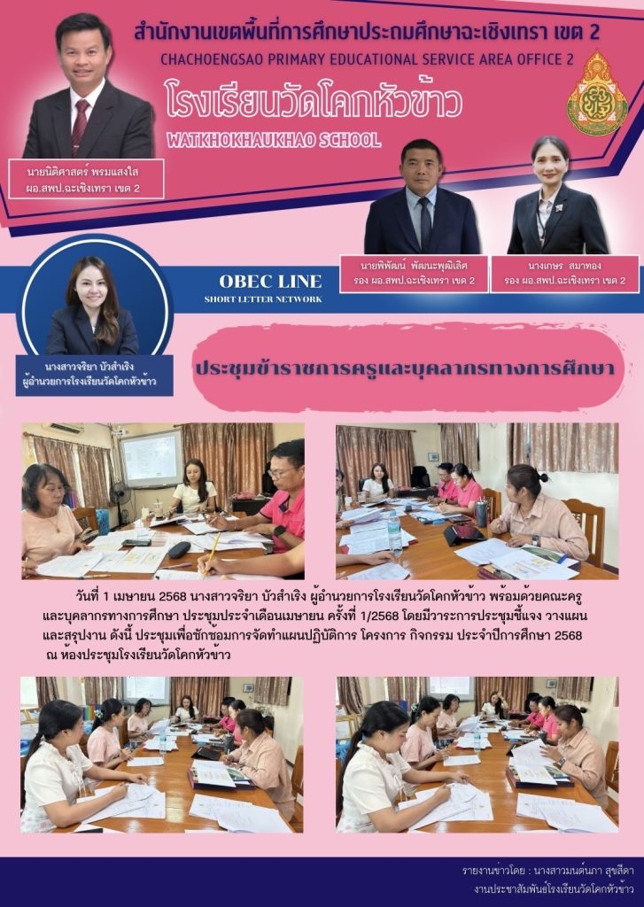 วันที่ 1 เมษายน 2568 นางสาวจริยา บัวสำเริง ผู้อำนวยการโรงเรียนวัดโคกหัวข้าว พร้อมด้วยคณะครูและบุคลากรทางการศึกษา ประชุมประจำเดือนเมษายน ครั้งที่ 1/2568 โดยมีวาระการประชุมชี้แจง วางแผน และสรุปงาน ดังนี้ ประชุมเพื่อซักซ้อมการจัดทำแผนปฏิบัติการ โครงการ กิจกรรม ประจำปีการศึกษา 2568