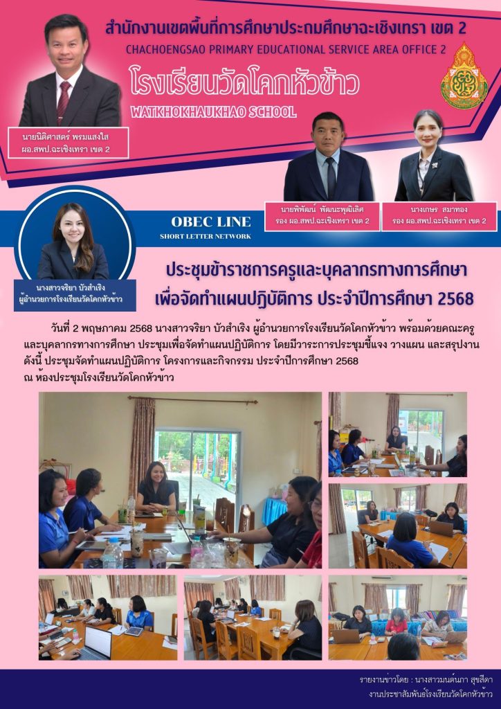 วันที่ 2 พฤษภาคม 2568 นางสาวจริยา บัวสำเริง ผู้อำนวยการโรงเรียนวัดโคกหัวข้าว พร้อมด้วยคณะครู และบุคลากรทางการศึกษา ประชุมเพื่อจัดทำแผนปฏิบัติการ โดยมีวาระการประชุมชี้แจง วางแผน และสรุปงาน ดังนี้ ประชุมจัดทำแผนปฏิบัติการ โครงการและกิจกรรม ประจำปีการศึกษา 2568 ณ ห้องประชุมโรงเรียนวัดโคกหัวข้าว