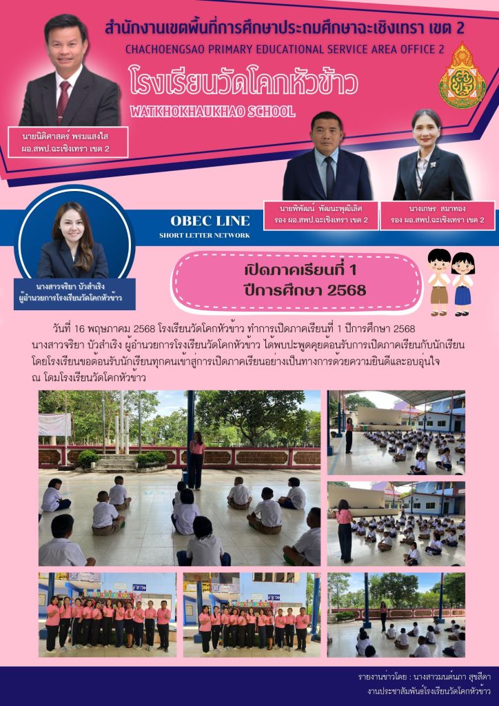 วันที่ 16 พฤษภาคม 2568 โรงเรียนวัดโคกหัวข้าว ทำการเปิดภาคเรียนที่ 1 ปีการศึกษา 2568 นางสาวจริยา บัวสำเริง ผู้อำนวยการโรงเรียนวัดโคกหัวข้าว ได้พบปะพูดคุยต้อนรับการเปิดภาคเรียนกับนักเรียน โดยโรงเรียนขอต้อนรับนักเรียนทุกคนเข้าสู่การเปิดภาคเรียนอย่างเป็นทางการด้วยความยินดีและอบอุ่นใจ ณ โดมโรงเรียนวัดโคกหัวข้าว