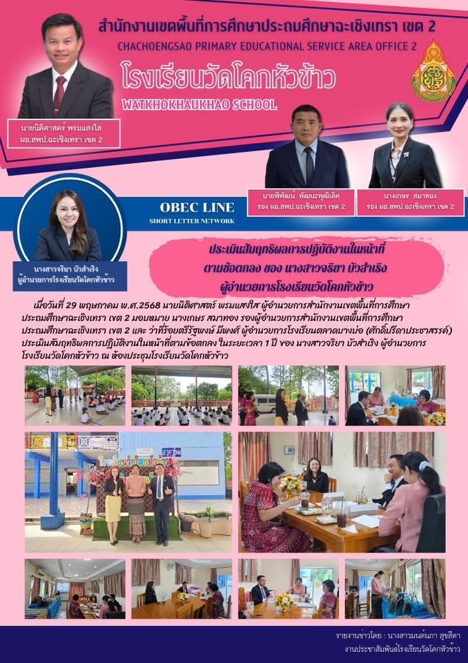 เมื่อวันที่ 29 พฤษภาคม พ.ศ.2568 นายนิติศาสตร์ พรมแสงใส ผู้อำนวยการสำนักงานเขตพื้นที่การศึกษาประถมศึกษาฉะเชิงเทรา เขต 2 มอบหมาย นางเกษร สมาทอง รองผู้อำนวยการสำนักงานเขตพื้นที่การศึกษาประถมศึกษาฉะเชิงเทรา เขต 2 และ ว่าที่ร้อยตรีรัฐพงษ์ มีพงศ์ ผู้อำนวยการโรงเรียนตลาดบางบ่อ (ศักดิ์ปรีดาประชาสรรค์) ประเมินสัมฤทธิผลการปฏิบัติงานในหน้าที่ตามข้อตกลง ในระยะเวลา 1 ปี ของ นางสาวจริยา บัวสำเริง ผู้อำนวยการโรงเรียนวัดโคกหัวข้าว ณ ห้องประชุมโรงเรียนวัดโคกหัวข้าว