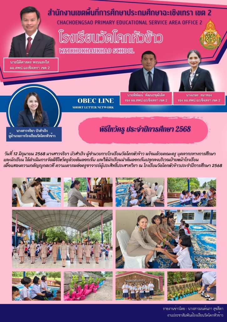 วันที่ 12 มิถุนายน 2568 นางสาวจริยา บัวสำเริง ผู้อำนวยการโรงเรียนวัดโคกหัวข้าว พร้อมด้วยคณะครู บุคลากรทางการศึกษาและนักเรียน ได้ดำเนินการจัดพิธีไหว้ครูด้วยต้นดอกเข็ม และให้นักเรียนนำต้นดอกเข็มปลูกลงบริเวณป้ายหน้าโรงเรียน เพื่อแสดงความกตัญญูกตเวที ความเคารพต่อครูอาจารย์ผู้ประสิทธิ์ประสาทวิชา ณ โรงเรียนวัดโคกหัวข้าวประจำปีการศึกษา 2568