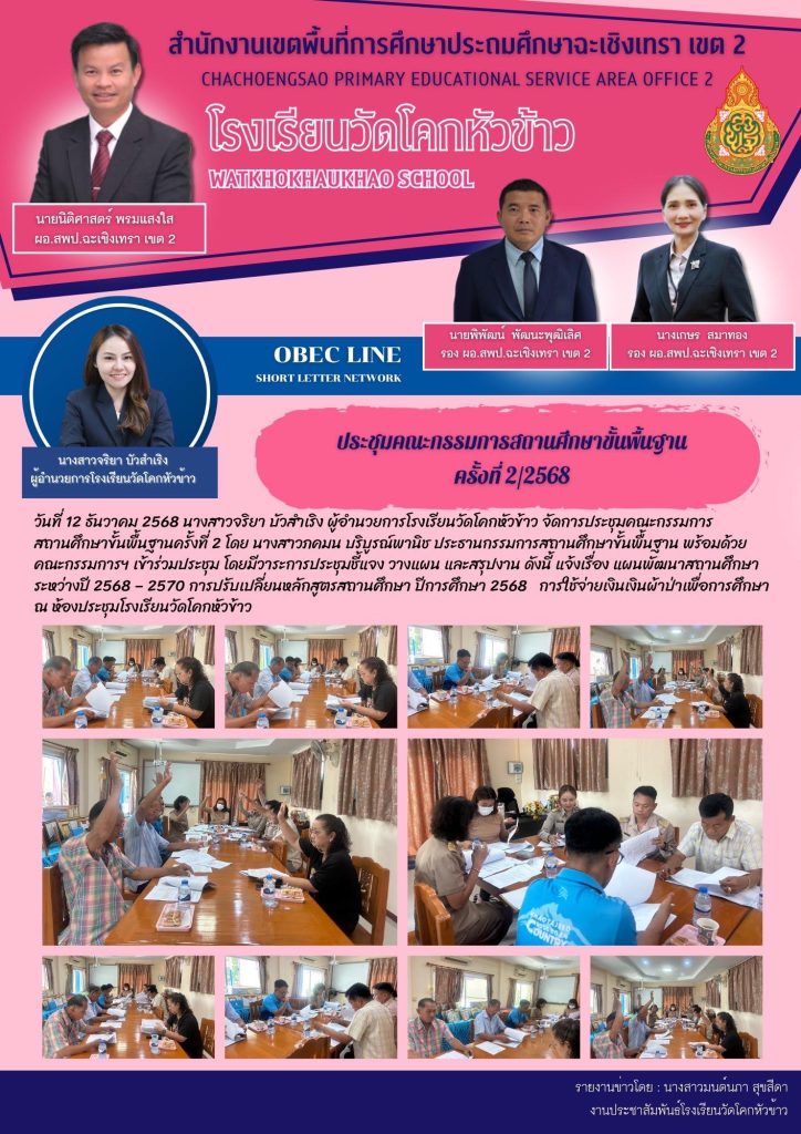 วันที่ 12 มิถุนายน 2568 นางสาวจริยา บัวสำเริง ผู้อำนวยการโรงเรียนวัดโคกหัวข้าว พร้อมด้วยคณะครู และบุคลากรทางการศึกษา โดยมีวาระการประชุมชี้แจง วางแผน และสรุปงาน ดังนี้ การจัดการศึกษาโดยยึดผลลัพธ์ตามวิสัยทัศน์ของสถานศึกษา การประเมินผลการปฏิบัติงานด้านการเงินการบัญชี กำหนดการนิเทศการสอน แนวทางการขับเคลื่อน “โครงการโรงเรียนวิถีพุทธชั้นนำ” และการเยี่ยมบ้านนักเรียน ณ ห้องประชุมโรงเรียนวัดโคกหัวข้าว