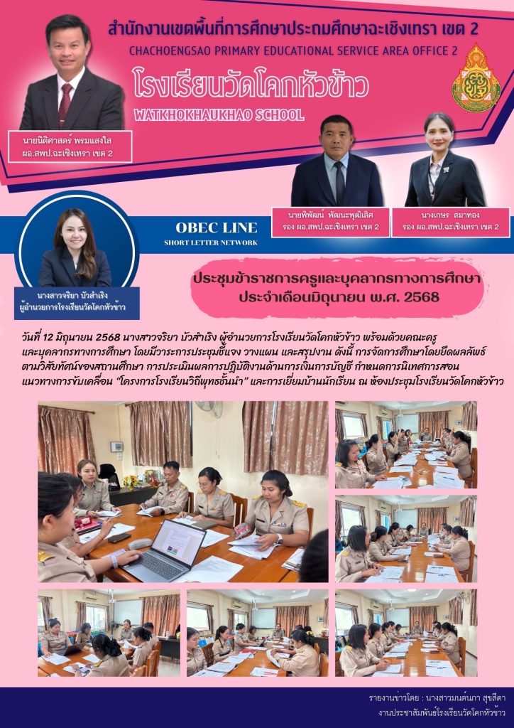 วันที่ 12 มิถุนายน 2568 นางสาวจริยา บัวสำเริง ผู้อำนวยการโรงเรียนวัดโคกหัวข้าว พร้อมด้วยคณะครูและบุคลากรทางการศึกษา โดยมีวาระการประชุมชี้แจง วางแผน และสรุปงาน ดังนี้ การจัดการศึกษาโดยยึดผลลัพธ์ตามวิสัยทัศน์ของสถานศึกษา