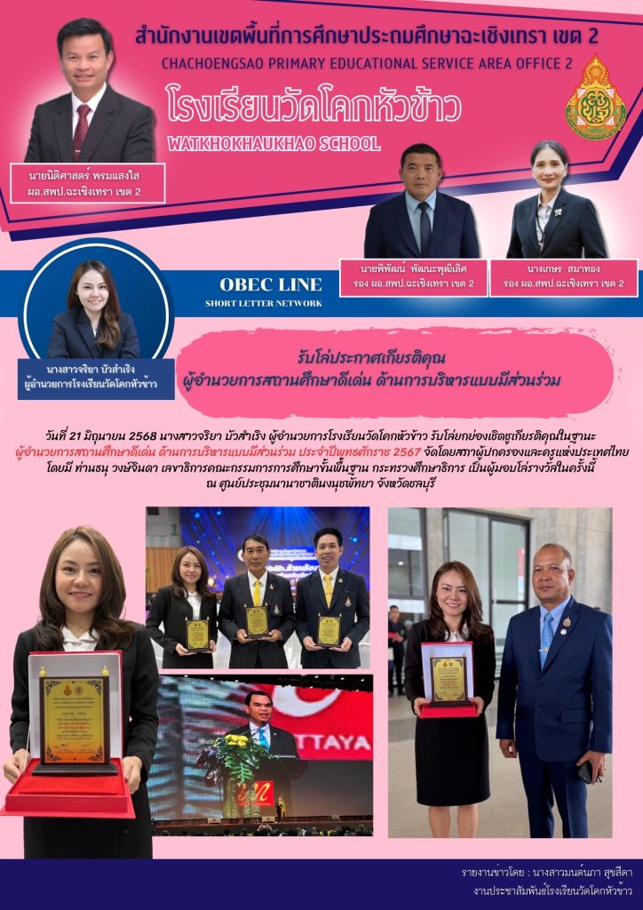วันที่ 21 มิถุนายน 2568 นางสาวจริยา บัวสำเริง ผู้อำนวยการโรงเรียนวัดโคกหัวข้าว รับโล่ยกย่องเชิดชูเกียรติคุณในฐานะ ผู้อำนวยการสถานศึกษาดีเด่น ด้านการบริหารแบบมีส่วนร่วม ประจำปีพุทธศักราช 2567 จัดโดยสภาผู้ปกครองและครูแห่งประเทศไทย โดยมี ท่านธนุ วงษ์จินดา เลขาธิการคณะกรรมการการศึกษาขั้นพื้นฐาน กระทรวงศึกษาธิการ เป็นผู้มอบโล่รางวัลในครั้งนี้ ณ ศูนย์ประชุมนานาชาตินงนุชพัทยา จังหวัดชลบุรี