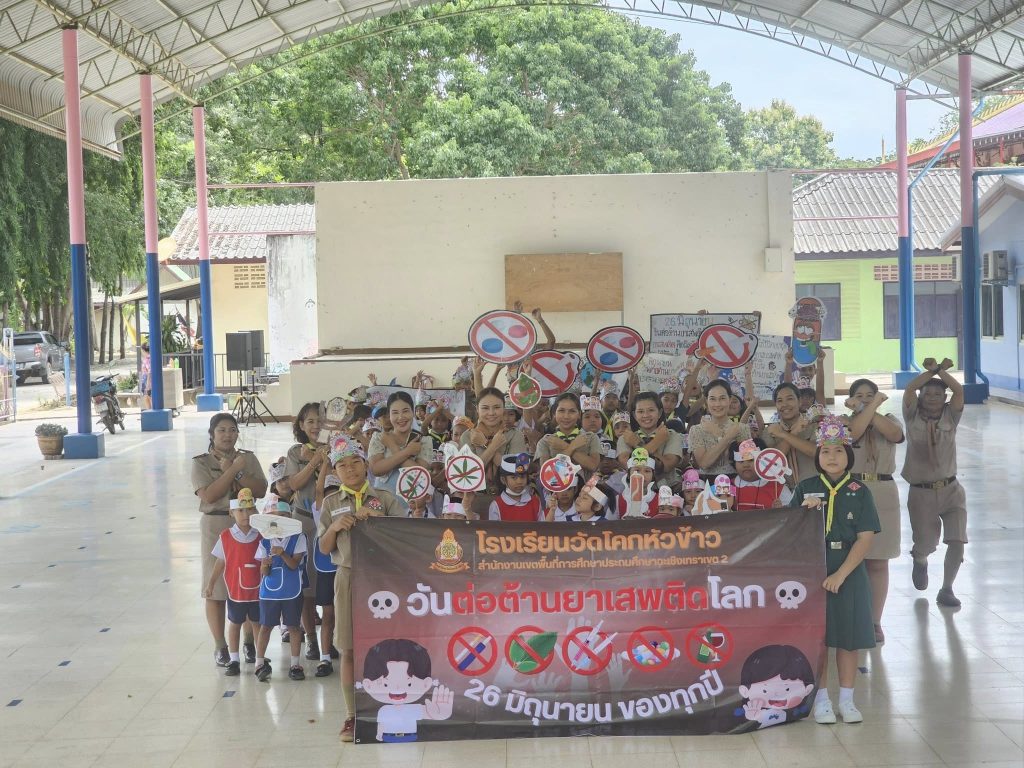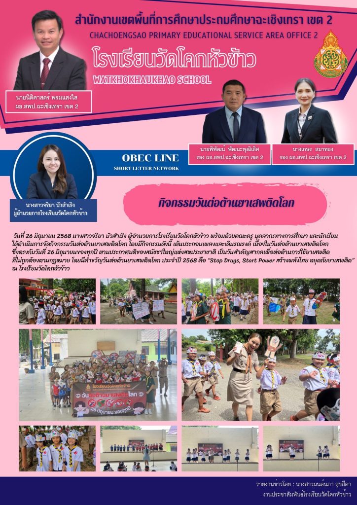 วันที่ 26 มิถุนายน 2568 นางสาวจริยา บัวสำเริง ผู้อำนวยการโรงเรียนวัดโคกหัวข้าว พร้อมด้วยคณะครู บุคลากรทางการศึกษา และนักเรียน ได้ดำเนินการจัดกิจกรรมวันต่อต้านยาเสพติดโลก โดยมีกิจกรรมดังนี้ เต้นประกอบเพลงและเดินรณรงค์ เนื่องในวันต่อต้านยาเสพติดโลก ซึ่งตรงกับวันที่ 26 มิถุนายนของทุกปี ตามประกาศมติของสมัชชาใหญ่แห่งสหประชาชาติ เป็นวันสำคัญสากลเพื่อต่อต้านการใช้ยาเสพติดที่ไม่ถูกต้องตามกฎหมาย โดยมีคำขวัญวันต่อต้านยาเสพติดโลก ประจำปี 2568 คือ “Stop Drugs, Start Power สร้างพลังไทย หยุดภัยยาเสพติด” ณ โรงเรียนวัดโคกหัวข้าว