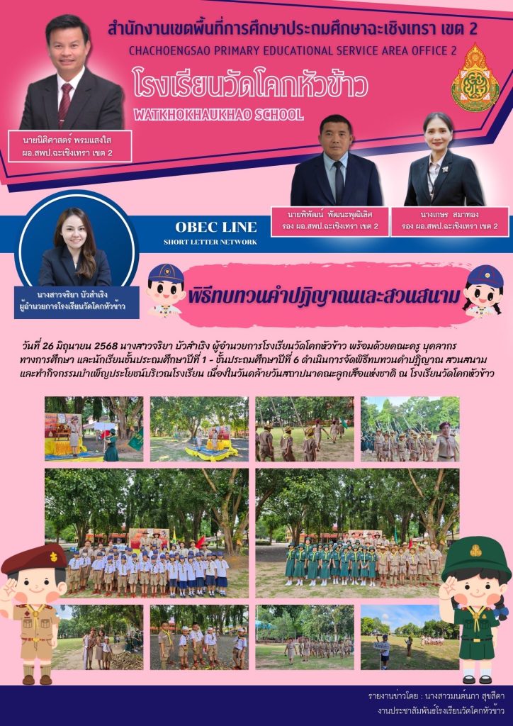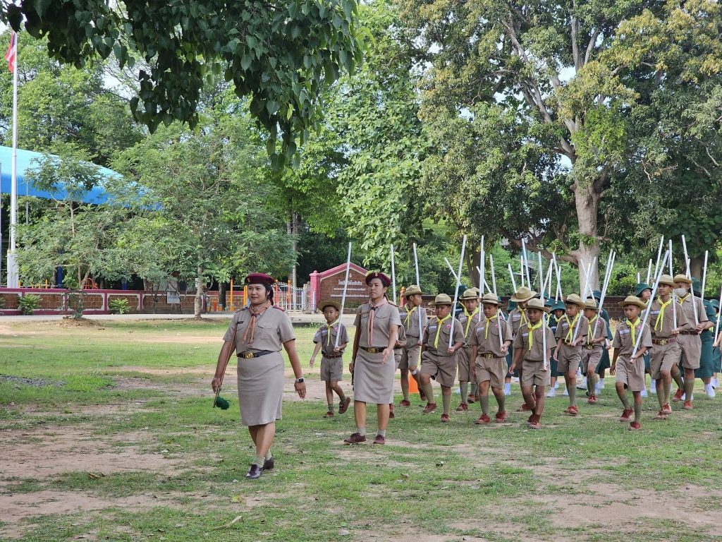 วันที่ 26 มิถุนายน 2568 นางสาวจริยา บัวสำเริง ผู้อำนวยการโรงเรียนวัดโคกหัวข้าว พร้อมด้วยคณะครู บุคลากรทางการศึกษา และนักเรียนชั้นประถมศึกษาปีที่ 1 – ชั้นประถมศึกษาปีที่ 6 ดำเนินการจัดพิธีทบทวนคำปฏิญาณ สวนสนาม และทำกิจกรรมบำเพ็ญประโยชน์บริเวณโรงเรียน เนื่องในวันคล้ายวันสถาปนาคณะลูกเสือแห่งชาติ ณ โรงเรียนวัดโคกหัวข้าว