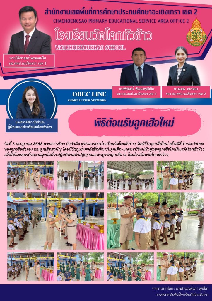 วันที่ 3 กรกฎาคม 2568 นางสาวจริยา บัวสำเริง ผู้อำนวยการโรงเรียนวัดโคกหัวข้าว จัดพิธีรับลูกเสือใหม่ หรือพิธีเข้าประจำกอง ของลูกเสือสำรอง และลูกเสือสามัญ โดยมีวัตถุประสงค์เพื่อต้อนรับลูกเสือ-เนตรนารีใหม่เข้าสู่กองลูกเสือโรงเรียนวัดโคกหัวข้าวเพื่อให้ได้แสดงถึงความมุ่งมั่นที่จะปฏิบัติตามคำปฏิญาณและกฎของลูกเสือ ณ โดมโรงเรียนวัดโคกหัวข้าว