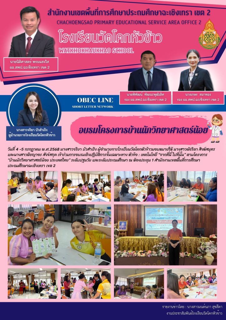 วันที่ 4 -5 กรกฎาคม พ.ศ.2568 นางสาวจริยา บัวสำเริง ผู้อำนวยการโรงเรียนวัดโคกหัวข้าวมอบหมายให้ นางสาวพัชริดา สิงห์สมุทร และนางสาวพิชญาอร สังข์สกุล เข้าร่วมการอบรมเชิงปฏิบัติการขั้นเฉพาะทาง หัวข้อ : เทคโนโลยี “จากที่นี่ ไปที่นั้น” ตามโครงการ “บ้านนักวิทยาศาสตร์น้อย ประเทศไทย” ระดับปฐมวัย และระดับประถมศึกษา ณ ห้องประชุม 1 สำนักงานเขตพื้นที่การศึกษาประถมศึกษาฉะเชิงเทรา เขต 2