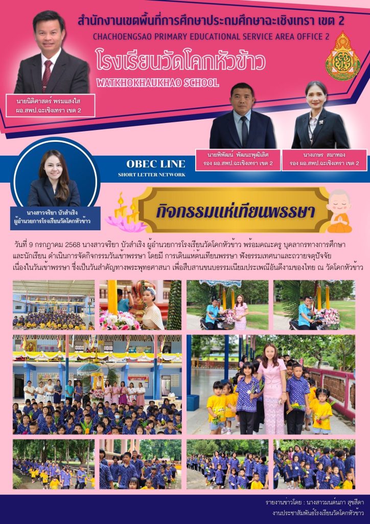 วันที่ 9 กรกฎาคม 2568 นางสาวจริยา บัวสำเริง ผู้อำนวยการโรงเรียนวัดโคกหัวข้าว พร้อมคณะครู บุคลากรทางการศึกษา และนักเรียน ดำเนินการจัดกิจกรรมวันเข้าพรรษา โดยมี การเดินแห่ต้นเทียนพรรษา ฟังธรรมเทศนาและถวายจตุปัจจัย เนื่องในวันเข้าพรรษา ซึ่งเป็นวันสำคัญทางพระพุทธศาสนา เพื่อสืบสานขนบธรรมเนียมประเพณีอันดีงามของไทย ณ วัดโคกหัวข้าว