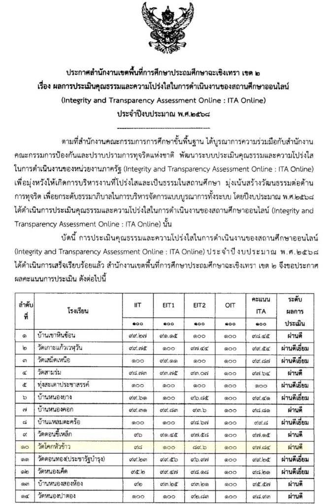 ผลการประเมินคุณธรรมและความโปร่งใส ในการดำเนินงานของสถานศึกษาออนไลน์ (ITA)