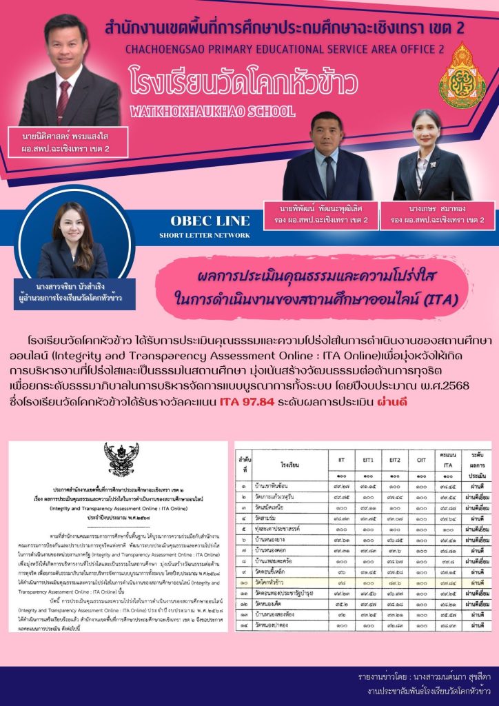 โรงเรียนวัดโคกหัวข้าว ได้รับการประเมินคุณธรรมและความโปร่งใสในการดำเนินงานของสถานศึกษาออนไลน์ (Integrity and Transparency Assessment Online : ITA Online)เพื่อมุ่งหวังให้เกิดการบริหารงานที่โปร่งใสและเป็นธรรมในสถานศึกษา มุ่งเน้นสร้างวัฒนธรรมต่อต้านการทุจริต เพื่อยกระดับธรรมาภิบาลในการบริหารจัดการแบบบูรณาการทั้งระบบ โดยปีงบประมาณ พ.ศ.2568 ซึ่งโรงเรียนวัดโคกหัวข้าวได้รับรางวัลคะแนน ITA 97.84 ระดับผลการประเมิน ผ่านดี