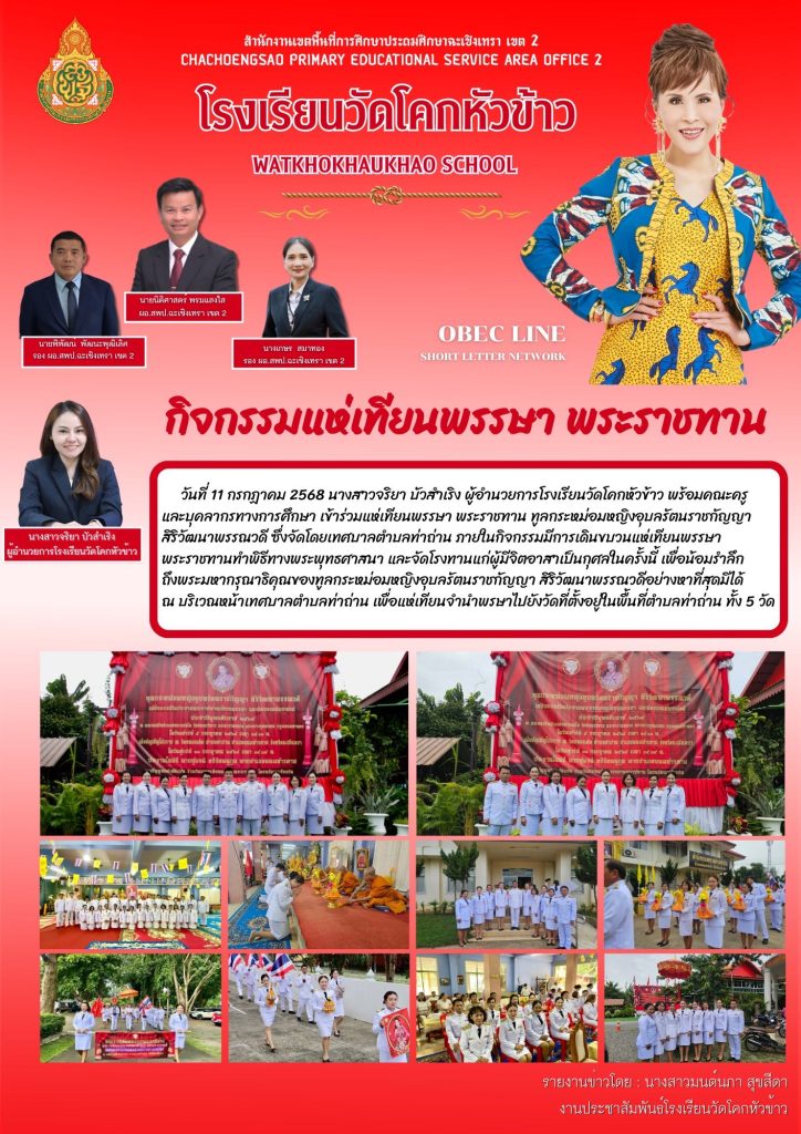วันที่ 11 กรกฏาคม 2568 นางสาวจริยา บัวสำเริง ผู้อำนวยการโรงเรียนวัดโคกหัวข้าว พร้อมคณะครูและบุคลากรทางการศึกษา เข้าร่วมแห่เทียนพรรษา พระราชทาน ทูลกระหม่อมหญิงอุบลรัตนราชกัญญา สิริวัฒนาพรรณวดี ซึ่งจัดโดยเทศบาลตำบลท่าถ่าน ภายในกิจกรรมมีการเดินขบวนแห่เทียนพรรษาพระราชทานทำพิธีทางพระพุทธศาสนา และจัดโรงทานแก่ผู้มีจิตอาสาเป็นกุศลในครั้งนี้ เพื่อน้อมรําลึกถึงพระมหากรุณาธิคุณของทูลกระหม่อมหญิงอุบลรัตนราชกัญญา สิริวัฒนาพรรณวดีอย่างหาที่สุดมิได้ ณ บริเวณหน้าเทศบาลตำบลท่าถ่าน เพื่อแห่เทียนจำนำพรรษาไปยังวัดที่ตั้งอยู่ในพื้นที่ตำบลท่าถ่าน ทั้ง 5 วัด