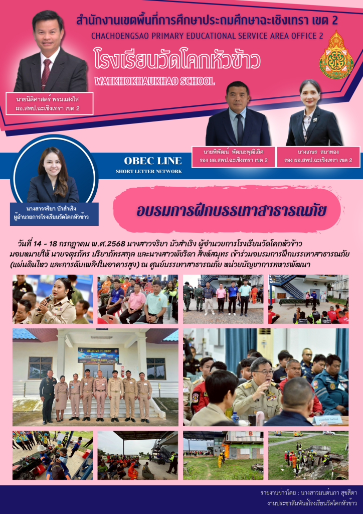 วันที่ 14 – 18 กรกฎาคม พ.ศ.2568 นางสาวจริยา บัวสำเริง ผู้อำนวยการโรงเรียนวัดโคกหัวข้าวมอบหมายให้ นายจตุรภัทร ปริยาภัทรสกุล และนางสาวพัชริดา สิงห์สมุทร เข้าร่วมอบรมการฝึกบรรเทาสาธารณภัย (แผ่นดินไหว และการดับเพลิงในอาคารสูง) ณ ศูนย์บรรเทาสาธารณภัย หน่วยบัญชาการทหารพัฒนา