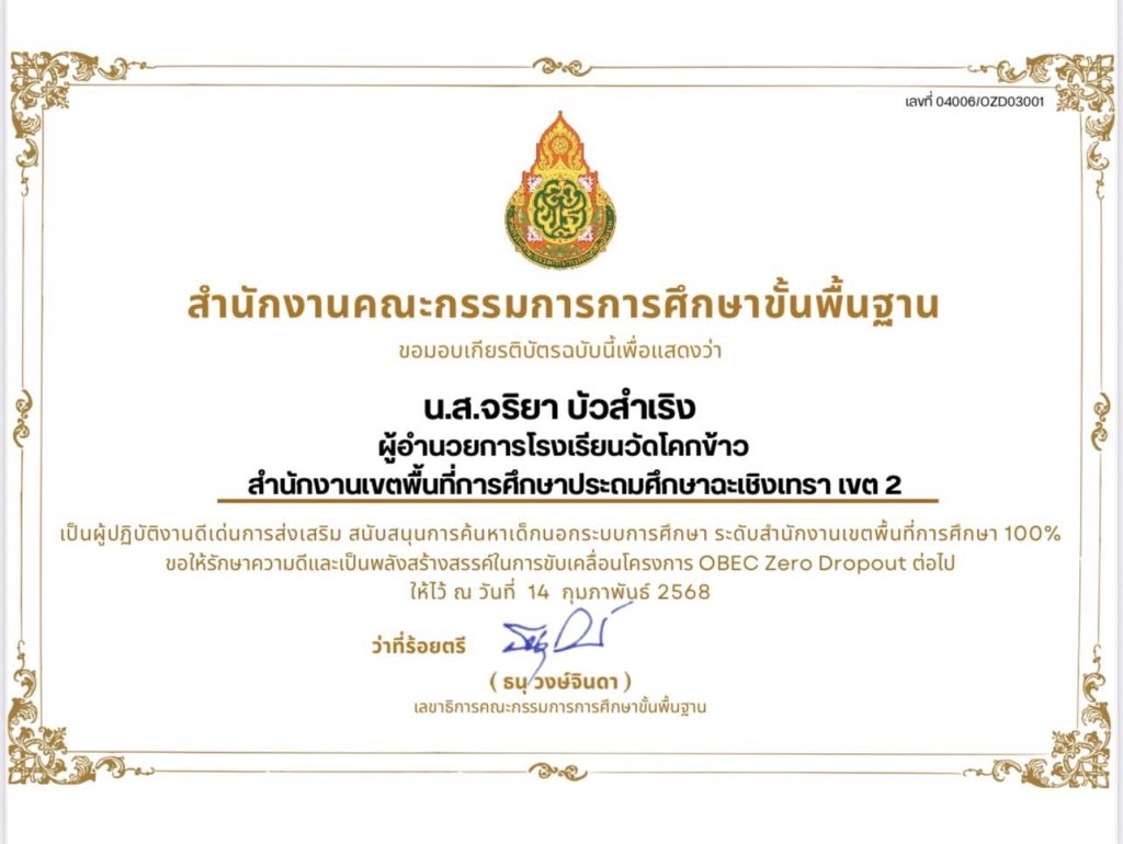 ขอแสดงความยินดีกับ นางสาวจริยา บัวสำเริง ผู้อำนวยการโรงเรียนวัดโคกหัวข้าว ที่ได้รับรางวัลผู้ปฏิบัติงานดีเด่นการส่งเสริม สนับสนุนการค้นหาเด็กนอกระบบการศึกษา ระดับสำนักงานเขตพื้นที่การศึกษา 100% ในโครงการ OBEC Zero Dropout