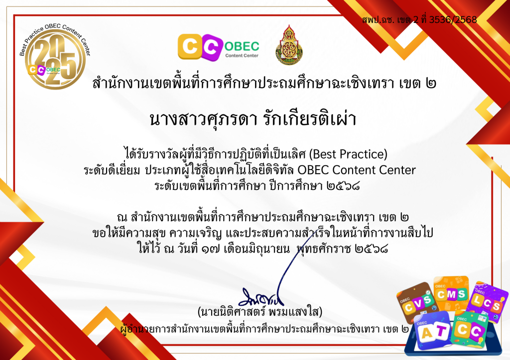 ขอแสดงความยินดีกับ นางสาวศุภรดา รักเกียรติเผ่า ครูผู้สอนรายวิชาภาษาไทย ที่ได้รับรางวัลผลงานที่มีวิธีปฏิบัติที่เป็นเลิศ (Best Practice) ในโครงการพัฒนาและส่งเสริมการจัดการเรียนรู้ด้วยระบบคลังสื่อเทคโนโลยีดิจิทัล ระดับการศึกษาขั้นพื้นฐาน (OBEC Content Center) ประเภทผู้ใช้สื่อเทคโนโลยีดิจิทัล ระดับดีเยี่ยม