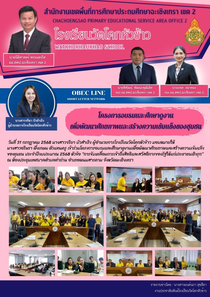 วันที่ 31 กรกฎาคม 2568 นางสาวจริยา บัวสำเริง ผู้อำนวยการโรงเรียนวัดโคกหัวข้าว มอบหมายให้ นางสาวอริษรา พึ่งเกษม ตัวแทนครู เข้าร่วมโครงการอบรมและศึกษาดูงานเพื่อพัฒนาศักยภาพและสร้างความเข้มแข็งของชุมชน ประจำปีงบประมาณ 2568 หัวข้อ “การขับเคลื่อนการเข้าถึงสิทธิและสวัสดิการของรัฐให้แก่ประชาชนเชิงรุก” ณ ห้องประชุมเทศบาลตำบลท่าถ่าน อำเภอพนมสารคาม จังหวัดฉะเชิงเทรา