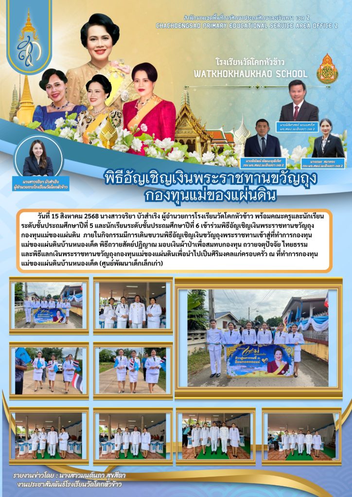 วันที่ 15 สิงหาคม 2568 นางสาวจริยา บัวสำเริง ผู้อำนวยการโรงเรียนวัดโคกหัวข้าว พร้อมคณะครูและนักเรียนระดับชั้นประถมศึกษาปีที่ 5 และนักเรียนระดับชั้นประถมศึกษาปีที่ 6 เข้าร่วมพิธีอัญเชิญเงินพระราชทานขวัญถุง กองทุนแม่ของแผ่นดิน ภายในกิจกรรมมีการเดินขบวนพิธีอัญเชิญเงินขวัญถุงพระราชทานเข้าสู่ที่ทำการกองทุนแม่ของแผ่นดินบ้านหนองเค็ด พิธีถวายสัตย์ปฏิญาณ มอบเงินผ้าป่าเพื่อสมทบกองทุน ถวายจตุปัจจัย ไทยธรรม และพิธีแลกเงินพระราชทานขวัญถุงกองทุนแม่ของแผ่นดินเพื่อนำไปเป็นศิริมงคลแก่ครอบครัว ณ ที่ทำการกองทุนแม่ของแผ่นดินบ้านหนองเค็ด (ศูนย์พัฒนาเด็กเล็กเก่า)