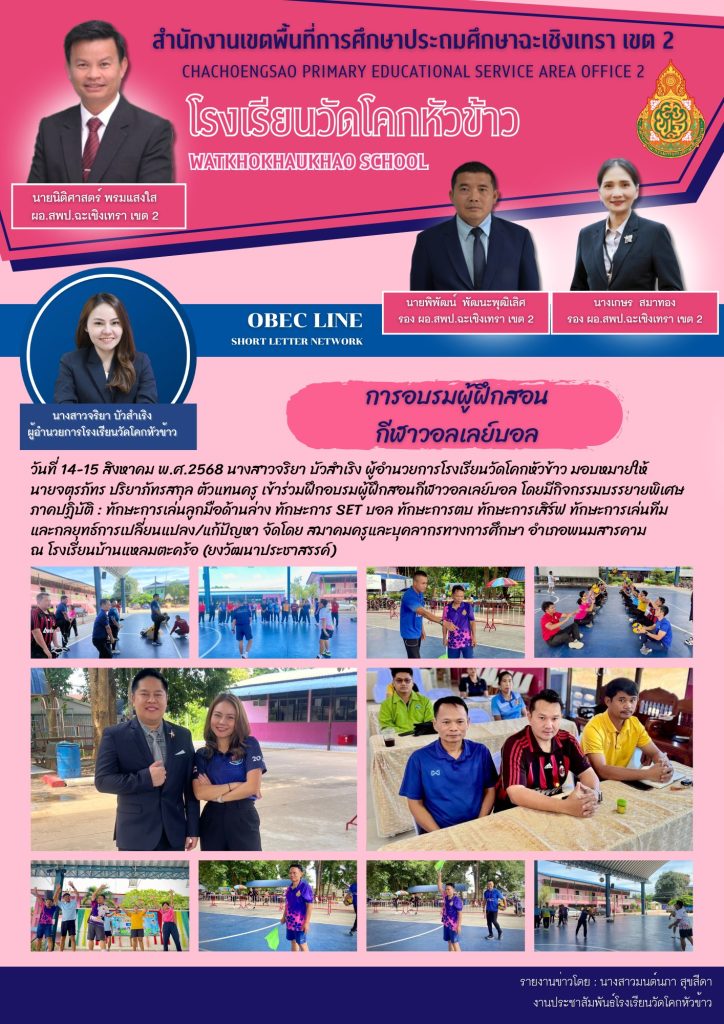 วันที่ 14-15 สิงหาคม พ.ศ.2568 นางสาวจริยา บัวสำเริง ผู้อำนวยการโรงเรียนวัดโคกหัวข้าว มอบหมายให้ นายจตุรภัทร ปริยาภัทรสกุล ตัวแทนครู เข้าร่วมฝึกอบรมผู้ฝึกสอนกีฬาวอลเลย์บอล โดยมีกิจกรรมบรรยายพิเศษ ภาคปฏิบัติ : ทักษะการเล่นลูกมือด้านล่าง ทักษะการ SET บอล ทักษะการตบ ทักษะการเสิร์ฟ ทักษะการเล่นทีม และกลยุทธ์การเปลี่ยนแปลง/แก้ปัญหา จัดโดย สมาคมครูและบุคลากรทางการศึกษา อำเภอพนมสารคาม ณ โรงเรียนบ้านแหลมตะคร้อ (ยงวัฒนาประชาสรรค์)