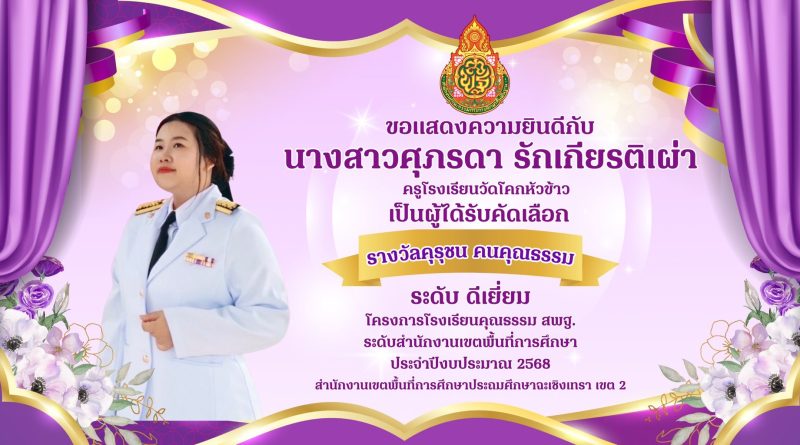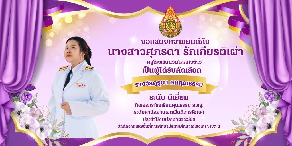 ขอแสดงความยินดีกับ นางสาวศุภรดา รักเกียรติเผ่า ครูผู้สอนรายวิชาภาษาไทย ที่ได้รับรางวัลคุรุชน คนคุณธรรม โครงการโรงเรียนคุณธรรม สพฐ. ระดับเขตพื้นที่การศึกษาประถมศึกษาฉะเชิงเทรา เขต 2 “ระดับดีเยี่ยม“