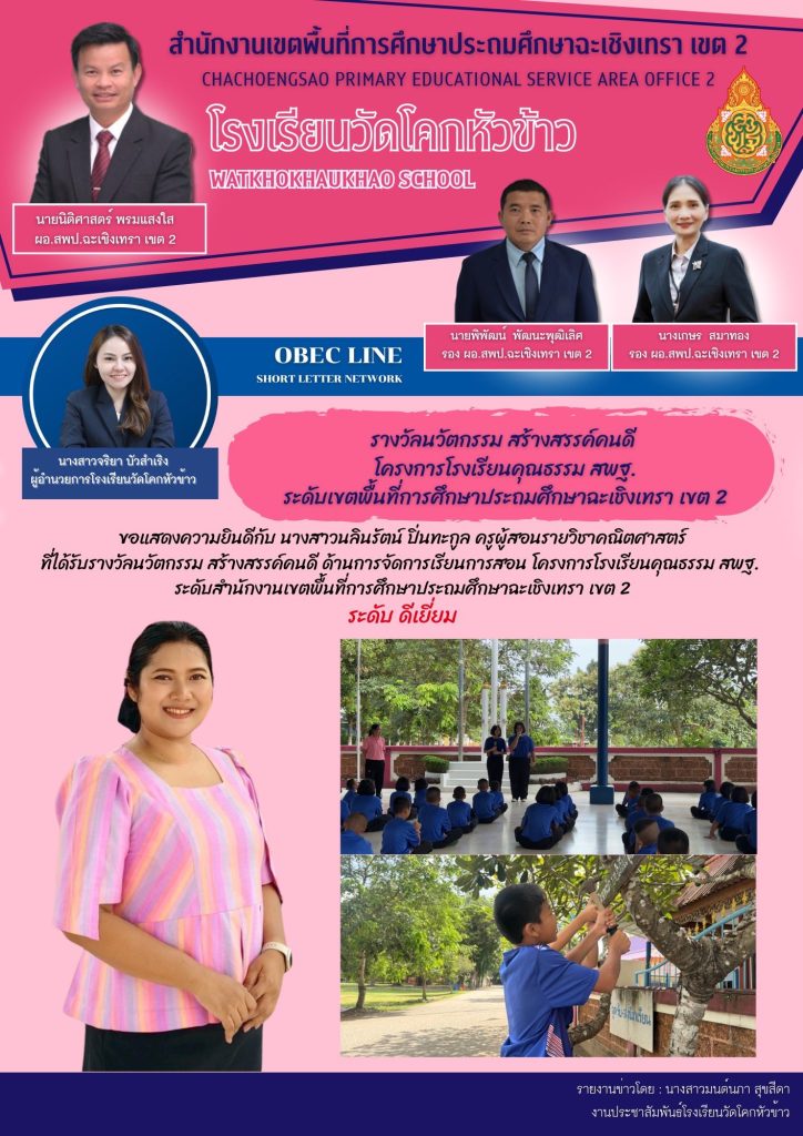 ขอแสดงความยินดีกับ นางสาวนลินรัตน์ ปิ่นทะกูล ครูผู้สอนรายวิชาคณิตศาสตร์ ที่ได้รับรางวัลนวัตกรรม สร้างสรรค์คนดี โครงการโรงเรียนคุณธรรม สพฐ. ระดับเขตพื้นที่การศึกษาประถมศึกษาฉะเชิงเทรา เขต 2 “ระดับดีเยี่ยม“