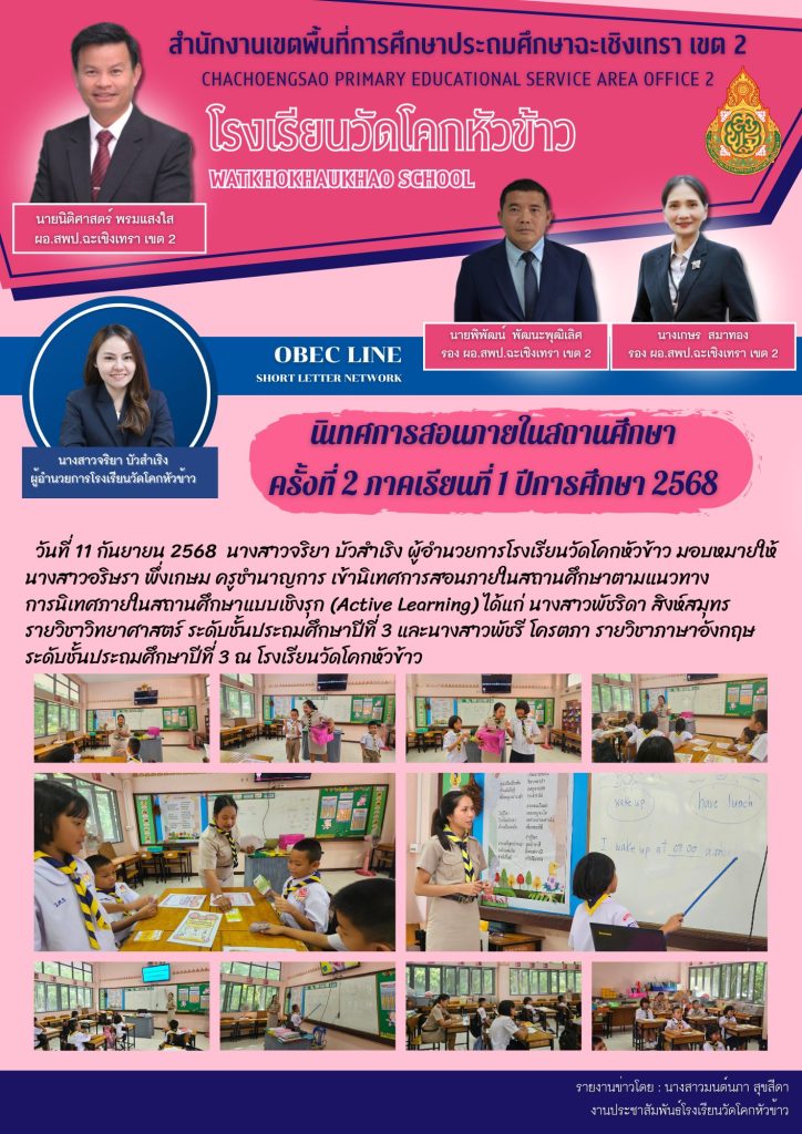 วันที่ 11 กันยายน 2568 นางสาวจริยา บัวสำเริง ผู้อำนวยการโรงเรียนวัดโคกหัวข้าว มอบหมายให้ นางสาวอริษรา พึ่งเกษม ครูชำนาญการ เข้านิเทศการสอนภายในสถานศึกษาตามแนวทางการนิเทศภายในสถานศึกษาแบบเชิงรุก (Active Learning) ได้แก่นางสาวพัชริดา สิงห์สมุทร รายวิชาวิทยาศาสตร์ ระดับชั้นประถมศึกษาปีที่ 3 และนางสาวพัชรี โครตภา รายวิชาภาษาอังกฤษ ระดับชั้นประถมศึกษาปีที่ 3 ณ โรงเรียนวัดโคกหัวข้าว